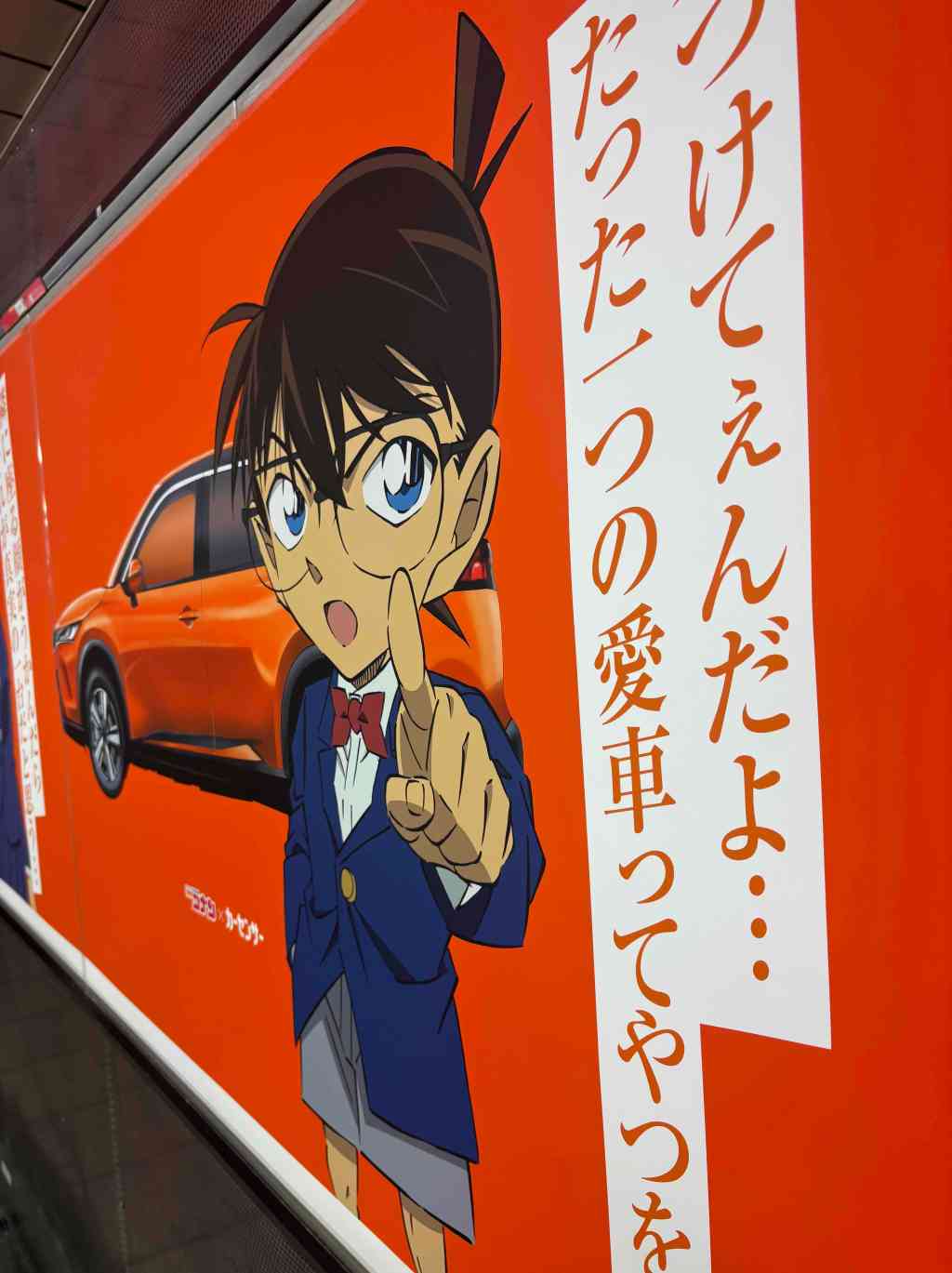 新宿駅地下道に掲載されていた「名探偵コナン」×「カーセンサー」の大判広告ーーについてちょっとした疑問の声があがっている。